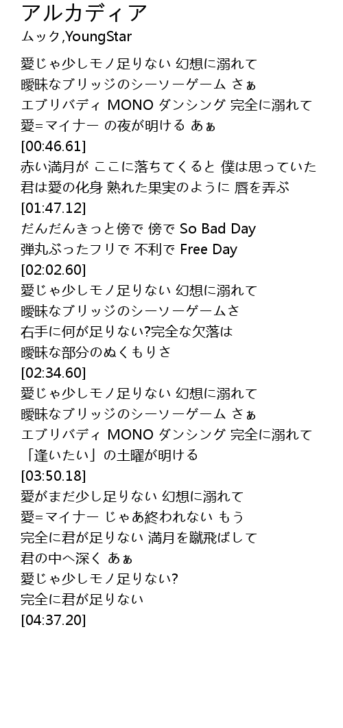 | [01:55.95] | 弾丸ぶったフリで 不利で Free Day |