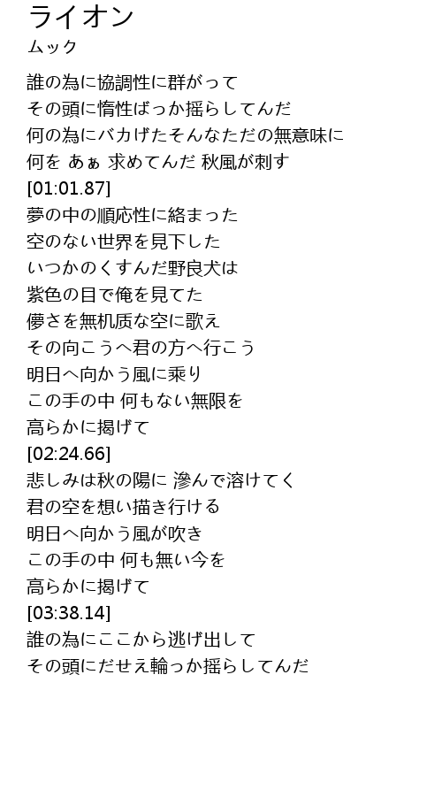| [01:23.36] | いつかのくすんだ野良犬は |