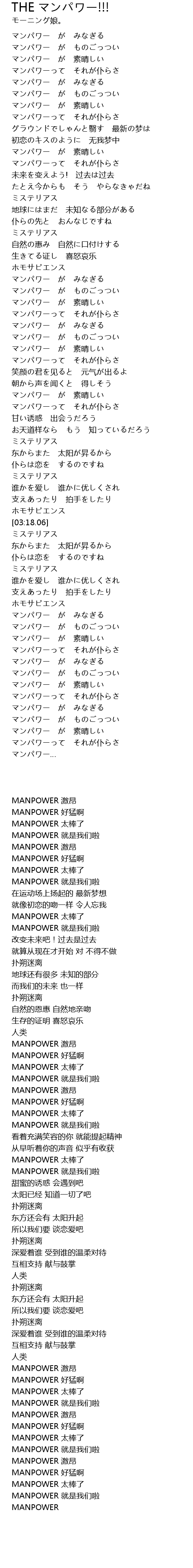 | [00:16.31] | MANPOWER 好猛啊 |