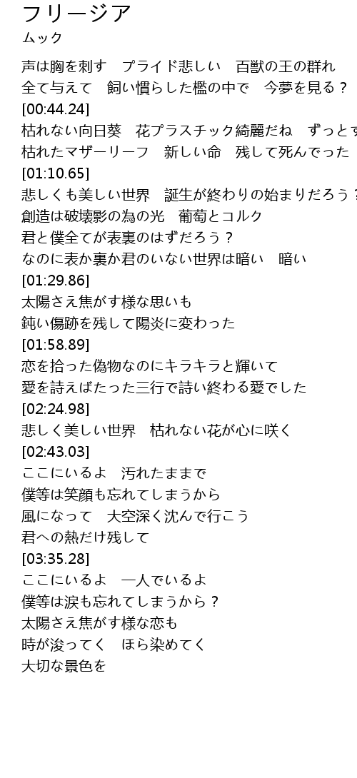 | [02:25.95] | 悲しく美しい世界 枯れない花が心に咲く |
