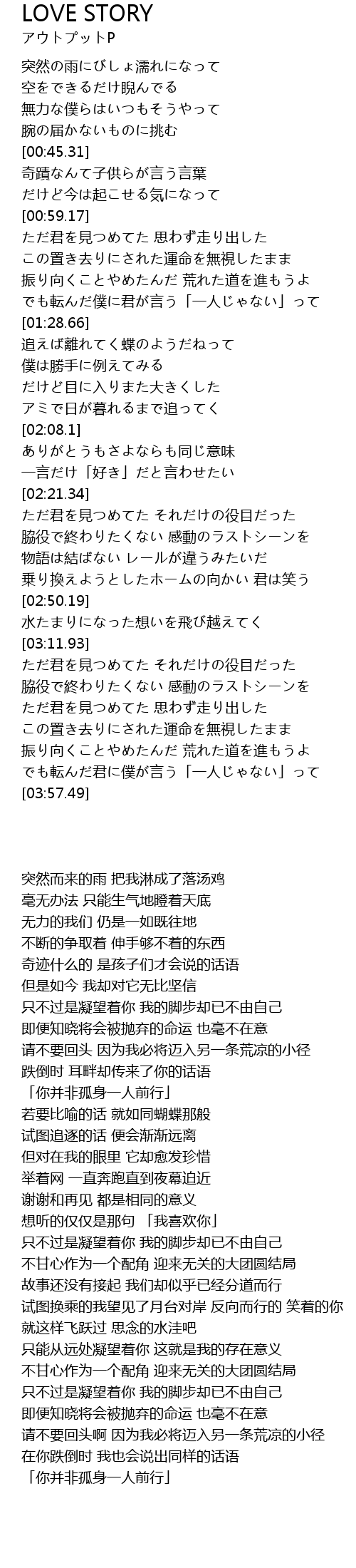 | [02:42.3] | 试图换乘的我望见了月台对岸 反向而行的 笑着的你 |