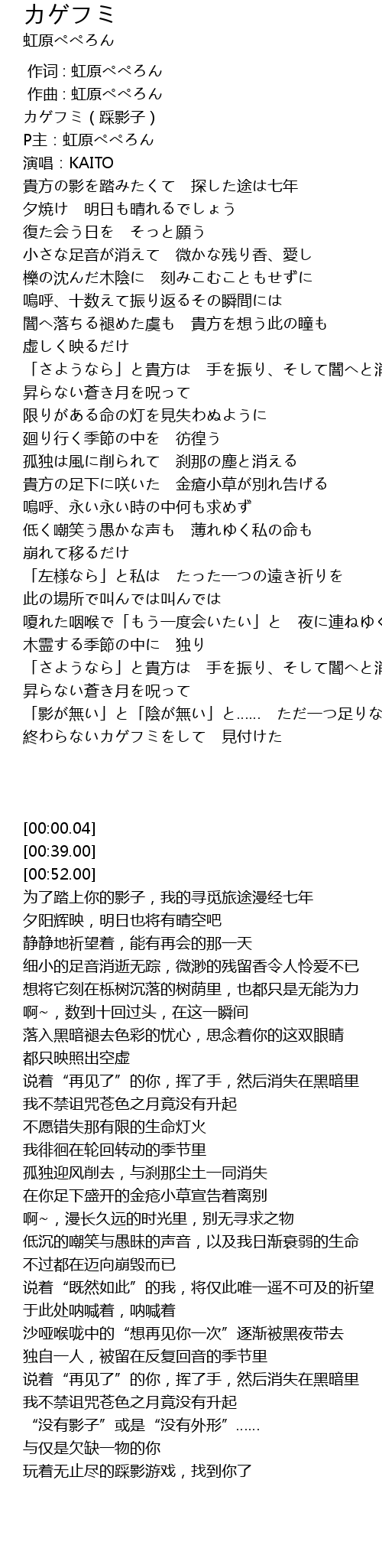 | [04:38.48] | 「影が無い」と「陰が無い」と…… ただ一つ足りない貴方を |
