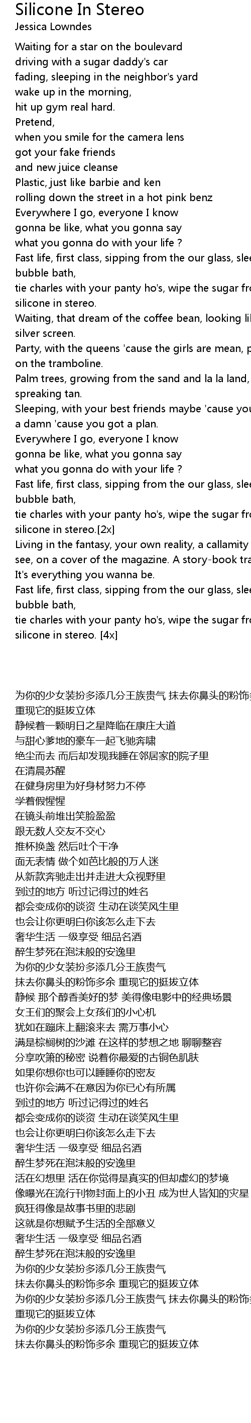 | [02:37.62]tie charles with your panty ho's, wipe the sugar from your nose, silicone in stereo. [4x] |
