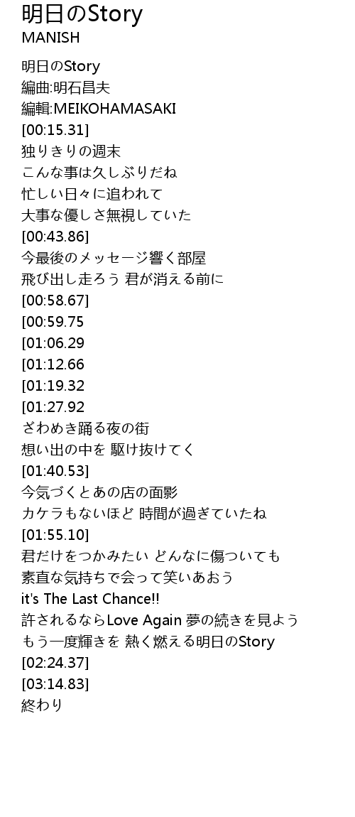 | [03:00.78][01:19.32] | もう一度賭けてみよう 信じている明日のStory |