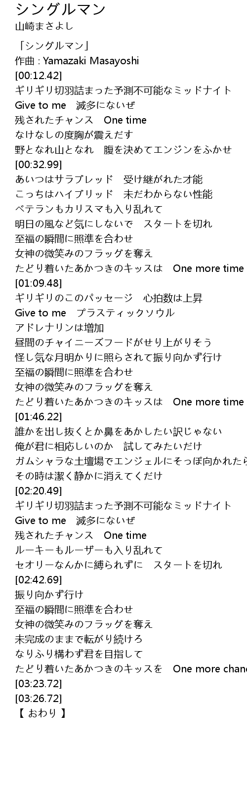 | [03:17.45] | たどり着いたあかつきのキッスを One more chance |