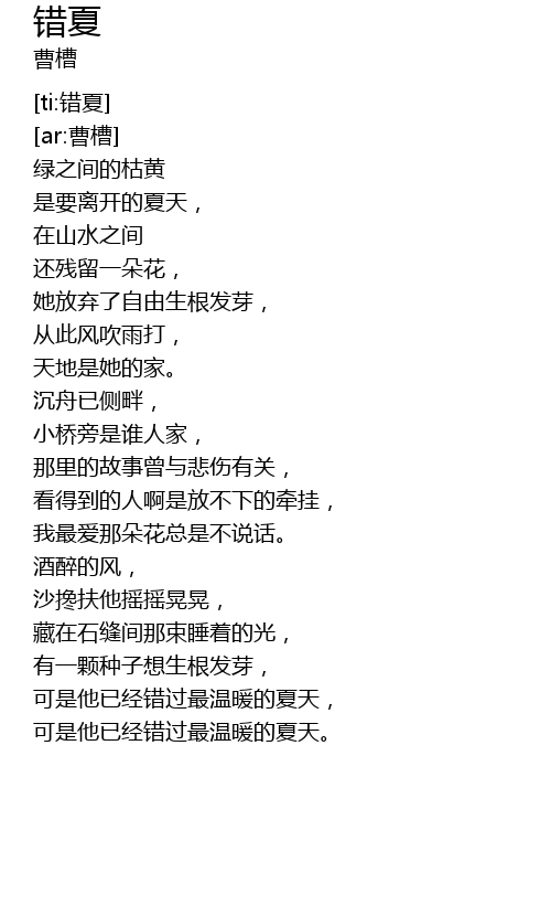 | [03:04.113] | ke shi ta yi jing cuo guo zui wen nuan de xia tian. |