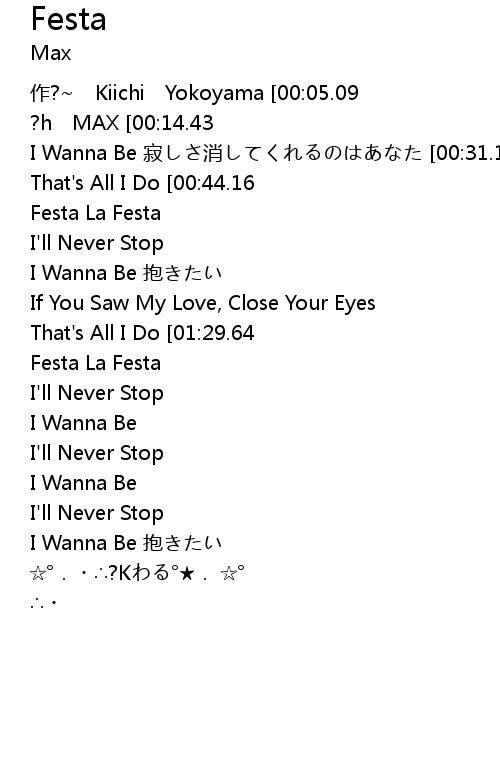 | [00:00.82]作?~ Kiichi Yokoyama [00:05.09]作曲 Kiichi Yokoyama [00:09.37]?h MAX [00:14.43]I'll Never Stop 乾いた胸をよぎる昨日 [00:21.68]I Wanna Be 寂しさ消してくれるのはあなた [00:31.13]If You Saw My Love, Close Your Eyes [00:38.48]That's All I Do [00:44.16]Festa La Festa 海岸を??る火が?eれながら [00:51.46]Festa La Festa 眠らない夜に溶けてく [00:59.91]I'll Never Stop ?bかな常夏の??国で [01:07.08]I Wanna Be 抱きたい 全てが消えないうちに [01:16.59]If You Saw My Love, Close Your Eyes [01:23.86]That's All I Do [01:29.64]Festa La Festa 少しだけ日??けした横??に [01:36.86]Festa La Festa 原色の蝶がたわむれ [01:45.38]I'll Never Stop ?垡酝猡膝攻畅`ルで流して [01:52.57]I Wanna Be 掴んだ新しい明日の?椁? [02:33.44]I'll Never Stop 乾いた胸をよぎる昨日 [02:40.77]I Wanna Be 寂しさ消してくれるのはあなた [02:48.22]I'll Never Stop ?bかな常夏の??国で [02:55.24]I Wanna Be 抱きたい 全てが消えないうちに [03:28.10] | ? K |