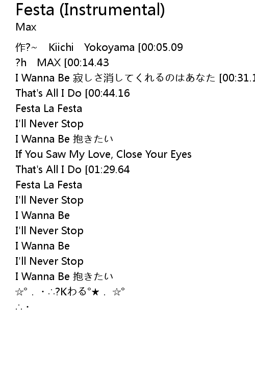 | [00:00.82]作?~ Kiichi Yokoyama [00:05.09]作曲 Kiichi Yokoyama [00:09.37]?h MAX [00:14.43]I'll Never Stop 乾いた胸をよぎる昨日 [00:21.68]I Wanna Be 寂しさ消してくれるのはあなた [00:31.13]If You Saw My Love, Close Your Eyes [00:38.48]That's All I Do [00:44.16]Festa La Festa 海岸を??る火が?eれながら [00:51.46]Festa La Festa 眠らない夜に溶けてく [00:59.91]I'll Never Stop ?bかな常夏の??国で [01:07.08]I Wanna Be 抱きたい 全てが消えないうちに [01:16.59]If You Saw My Love, Close Your Eyes [01:23.86]That's All I Do [01:29.64]Festa La Festa 少しだけ日??けした横??に [01:36.86]Festa La Festa 原色の蝶がたわむれ [01:45.38]I'll Never Stop ?垡酝猡膝攻畅`ルで流して [01:52.57]I Wanna Be 掴んだ新しい明日の?椁? [02:33.44]I'll Never Stop 乾いた胸をよぎる昨日 [02:40.77]I Wanna Be 寂しさ消してくれるのはあなた [02:48.22]I'll Never Stop ?bかな常夏の??国で [02:55.24]I Wanna Be 抱きたい 全てが消えないうちに [03:28.10] | ? K |