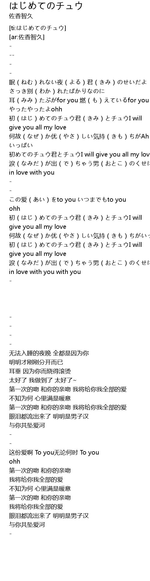 | [02:11.312] | 初(はじ)めてのチュウ君(きみ)とチュウI will give you all my love |