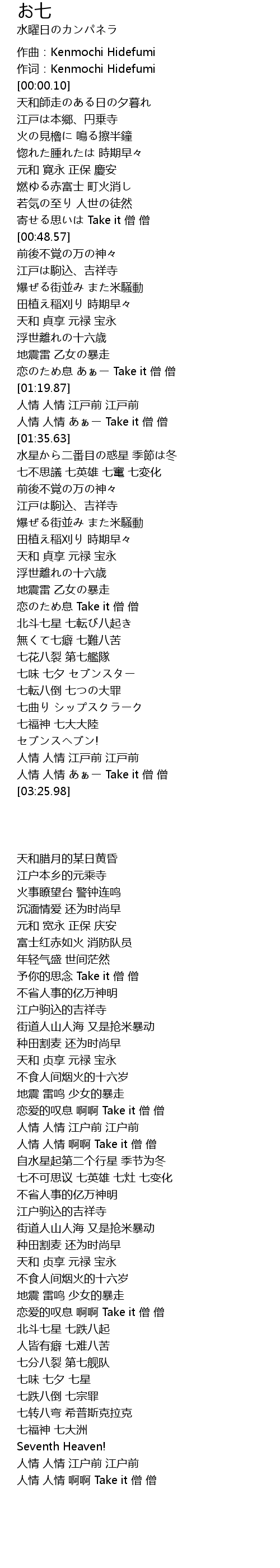 | [02:04.96] | 七不思議 七英雄 七竃 七変化 |
