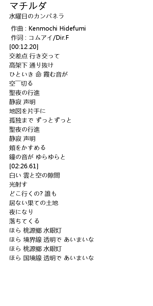 | [00:00.00] | 作曲 : Kenmochi Hidefumi |