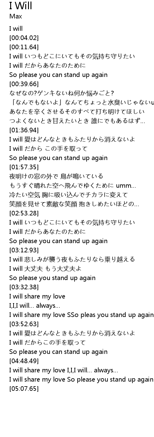 | [02:53.69] | I will いつもどこにいてもその気持ち守りたい |