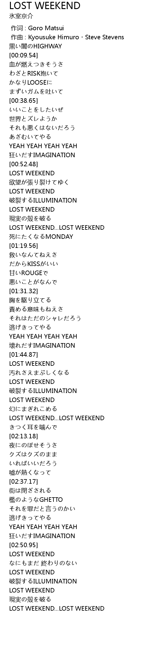 | [02:04.14] | LOST WEEKEND...LOST WEEKEND |
