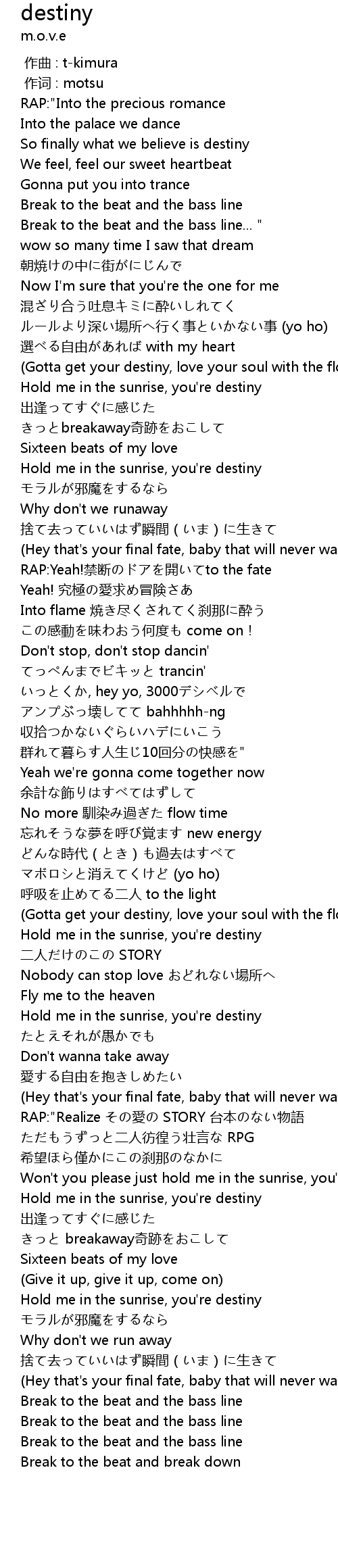 | [03:34.25] | Won't you please just hold me in the sunrise, you're destiny " |
