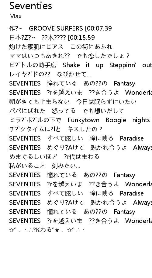 | [00:00.76]作?~ GROOVE SURFERS [00:07.39]作曲 GROOVE SURFERS [00:12.02]日本?Z?~ ??木???? [00:15.59]?h MAX [00:41.32]灼けた素肌にピアス この街にあふれ [00:48.07]ママはいつもあきれ?? でも恋したでしょ? [00:54.38]ビ?`トルの助手席 Shake it up Steppinn' out 笑ってた [01:00.72]レイヤ?`ドの?? なびかせて... [01:07.32]SEVENTIES 憧れている あの??の Fantasy [01:13.59]SEVENTIES ?rを越えいま ??き合うよ Wonderland [01:32.64]朝がきても止まらない 今日は眠らずにいたい [01:38.98]パパにばれた 怒ってる でも想いだして [01:45.35]ミラ?`ボ?`ルの下で Funkytown Boogie nights 踊ってた [01:51.73]チ?`クタイムに?lと キスしたの? [01:58.52]SEVENTIES すべて眩しい 瞳に映る Paradise [02:04.84]SEVENTIES めぐり?Aけて 魅かれ合うよ Always [02:10.90]めまぐるしいほど ?r代はまわる [02:17.22]私がいること 刻みたい... [02:36.87]SEVENTIES 憧れている あの??の Fantasy [02:43.20]SEVENTIES ?rを越えいま ??き合うよ Wonderland [02:49.66]SEVENTIES すべて眩しい 瞳に映る Paradise [02:56.01]SEVENTIES めぐり?Aけて 魅かれ合うよ Always [03:02.32]SEVENTIES 憧れている あの??の Fantasy [03:08.74]SEVENTIES ?rを越えいま ??き合うよ Wonderland [03:45.42] | ? K |