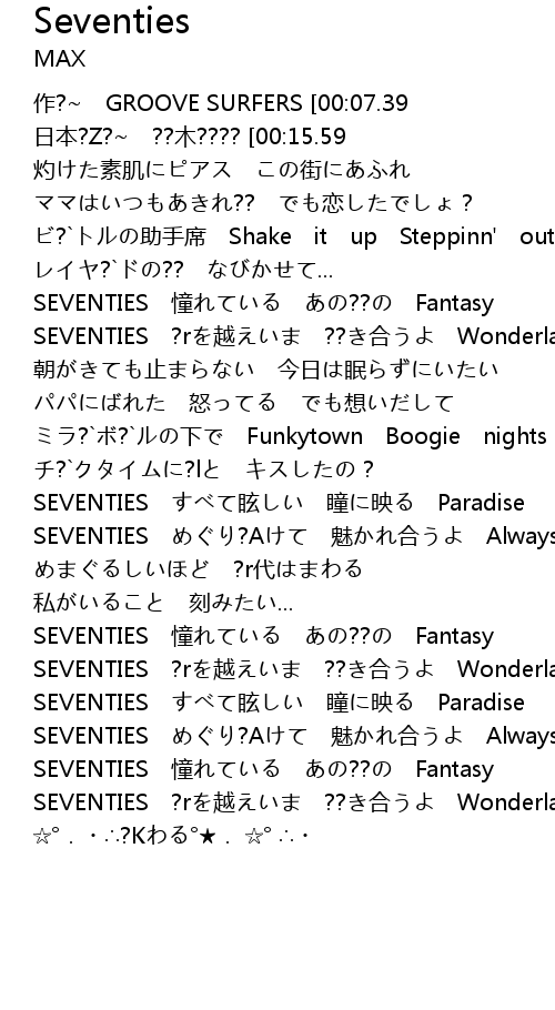 | [00:00.76]作?~ GROOVE SURFERS [00:07.39]作曲 GROOVE SURFERS [00:12.02]日本?Z?~ ??木???? [00:15.59]?h MAX [00:41.32]灼けた素肌にピアス この街にあふれ [00:48.07]ママはいつもあきれ?? でも恋したでしょ? [00:54.38]ビ?`トルの助手席 Shake it up Steppinn' out 笑ってた [01:00.72]レイヤ?`ドの?? なびかせて... [01:07.32]SEVENTIES 憧れている あの??の Fantasy [01:13.59]SEVENTIES ?rを越えいま ??き合うよ Wonderland [01:32.64]朝がきても止まらない 今日は眠らずにいたい [01:38.98]パパにばれた 怒ってる でも想いだして [01:45.35]ミラ?`ボ?`ルの下で Funkytown Boogie nights 踊ってた [01:51.73]チ?`クタイムに?lと キスしたの? [01:58.52]SEVENTIES すべて眩しい 瞳に映る Paradise [02:04.84]SEVENTIES めぐり?Aけて 魅かれ合うよ Always [02:10.90]めまぐるしいほど ?r代はまわる [02:17.22]私がいること 刻みたい... [02:36.87]SEVENTIES 憧れている あの??の Fantasy [02:43.20]SEVENTIES ?rを越えいま ??き合うよ Wonderland [02:49.66]SEVENTIES すべて眩しい 瞳に映る Paradise [02:56.01]SEVENTIES めぐり?Aけて 魅かれ合うよ Always [03:02.32]SEVENTIES 憧れている あの??の Fantasy [03:08.74]SEVENTIES ?rを越えいま ??き合うよ Wonderland [03:45.42] | ? K |