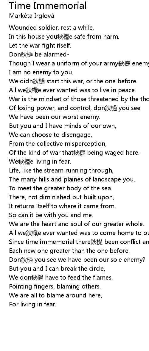 | [00:34.86] | Though I wear a uniform of your army鈥檚 enemy, |