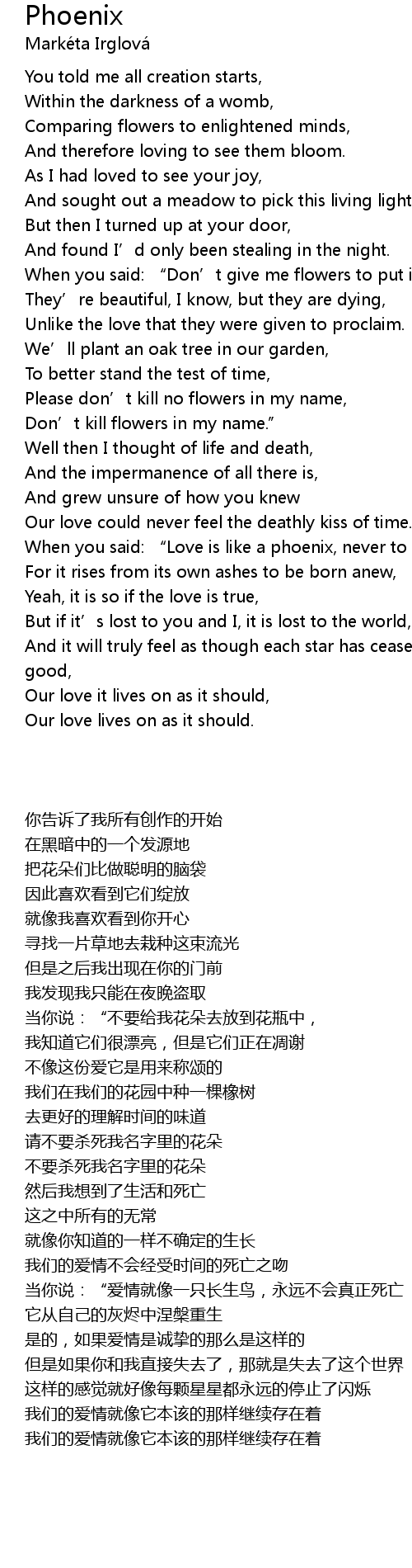 | [02:38.45] | When you said: “Love is like a phoenix, never to truly die, |