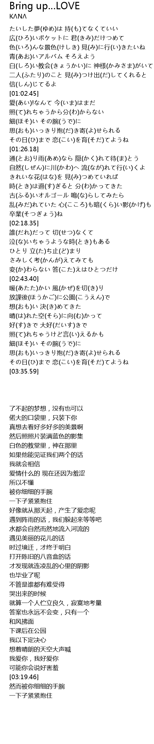 | [03:26.59] | その日(ひ)まで 恋(こい)を育(そだ)てようね |
