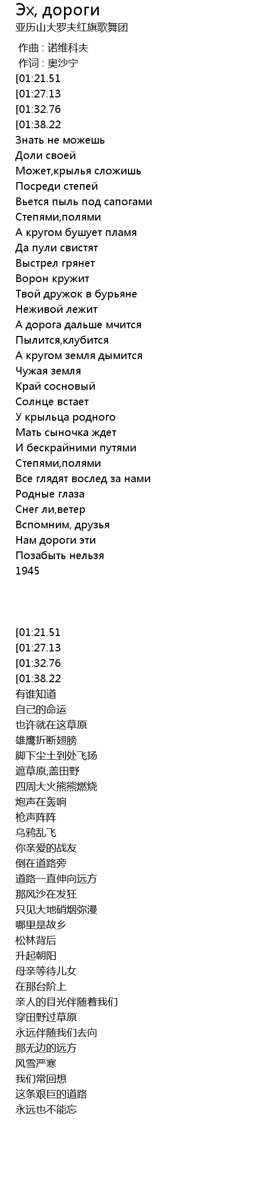 | [00:13.74][01:21.51][02:31.39][03:48.22] | Эх,дороги |