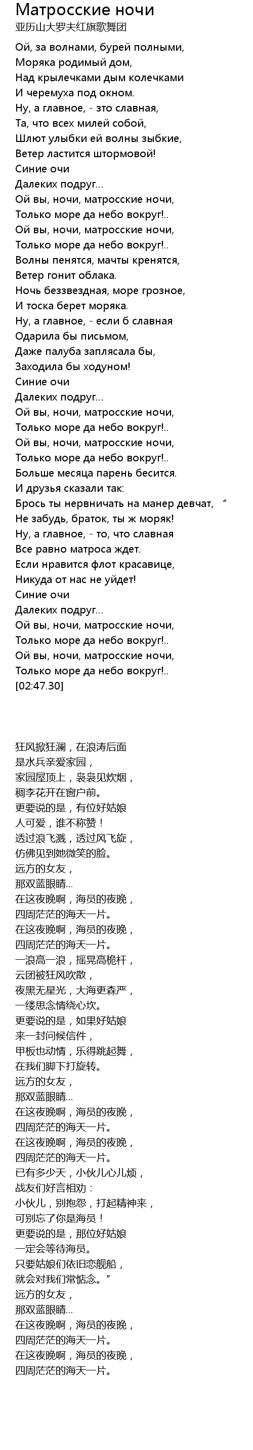 | [02:30.24] | Ой вы, ночи, матросские ночи, |