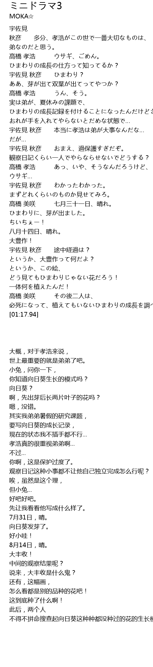 | [01:12.36] | 必死になって、植えてもいないひまわりの成長を調べる破目となったのだった。 |