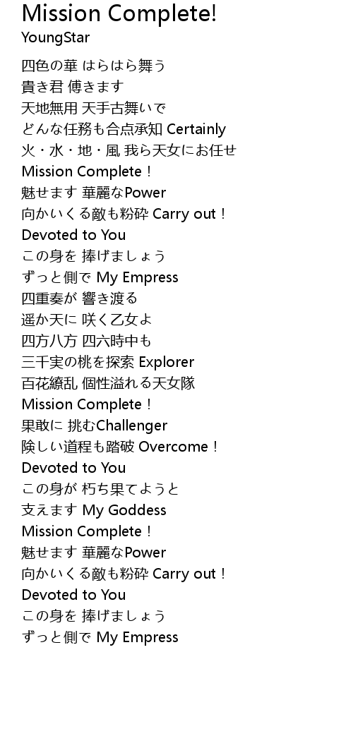 | 歌曲 | Mission Complete! |