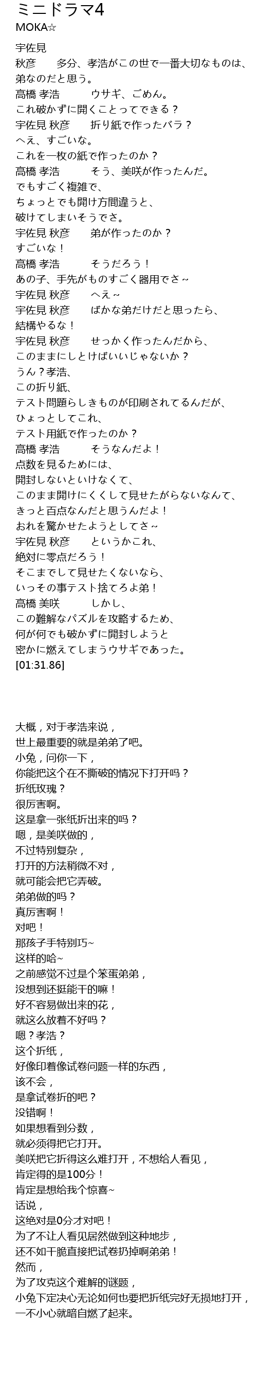 | [00:13.24] | 宇佐見 秋彦 折り紙で作ったバラ? |
