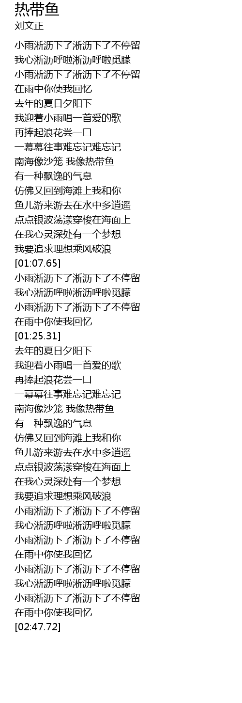 | [00:40.91] | nán hǎi xiàng shā lóng wǒ xiàng rè dài yú |