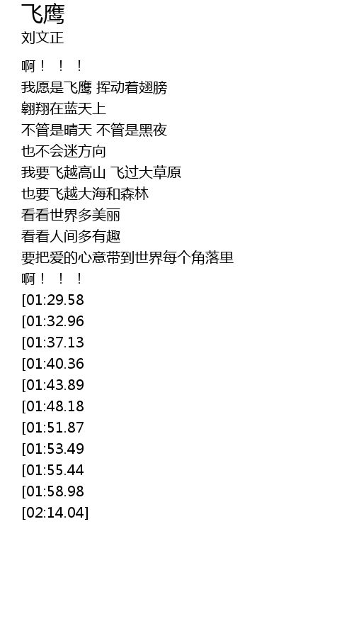 | [00:22.66] | 我愿是飞鹰 挥动着翅膀 |