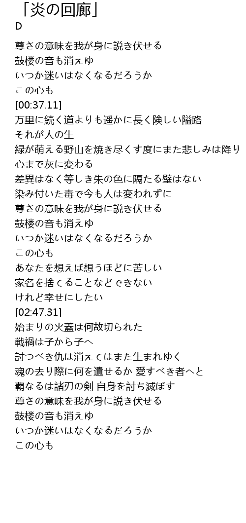 | [03:22.99] | 討つべき仇は消えてはまた生まれゆく |