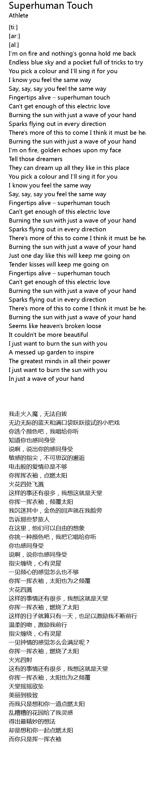 | [01:54.38] | Fingertips alive superhuman touch |