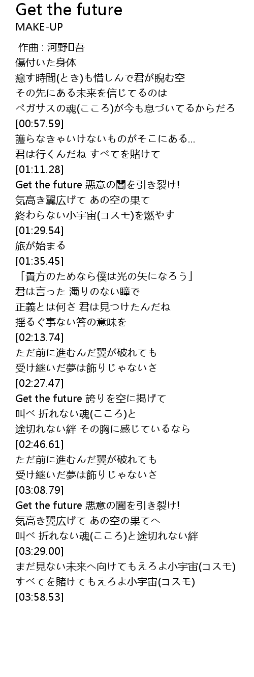 | [01:12.00] | Get the future 悪意の闇を引き裂け! |