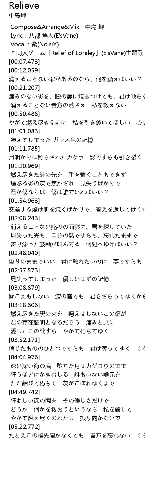 | [00:06.256] | *同人ゲーム「Relief of Loreley」(E'sVane)主題歌* |