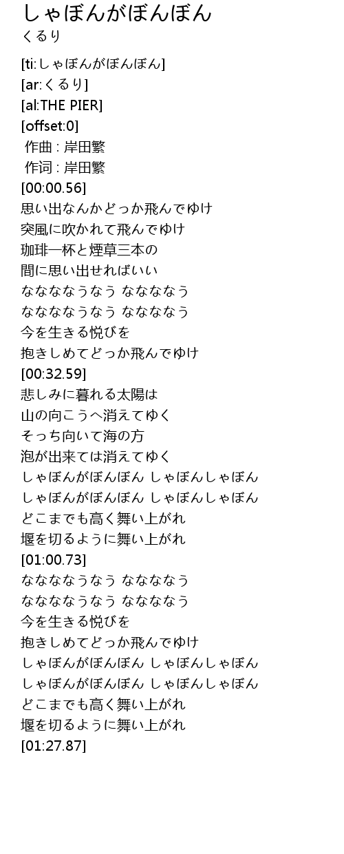| [00:53.32] | しゃぼんがぼんぼん しゃぼんしゃぼん |