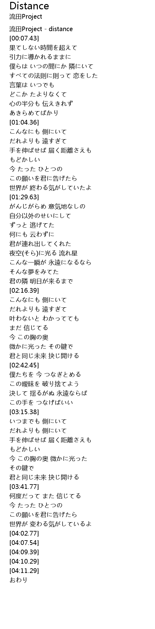 | [00:00.35] | 流田Project - distance |