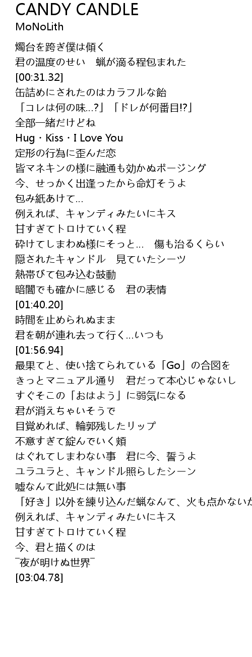 | [00:20.18] | 君の温度のせい 蝋が滴る程包まれた |