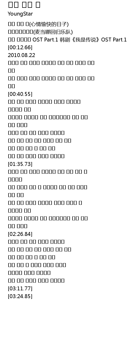 | [00:09.49] | 나는 전설이다 OST Part.1 韩剧《我是传说》OST Part.1 |