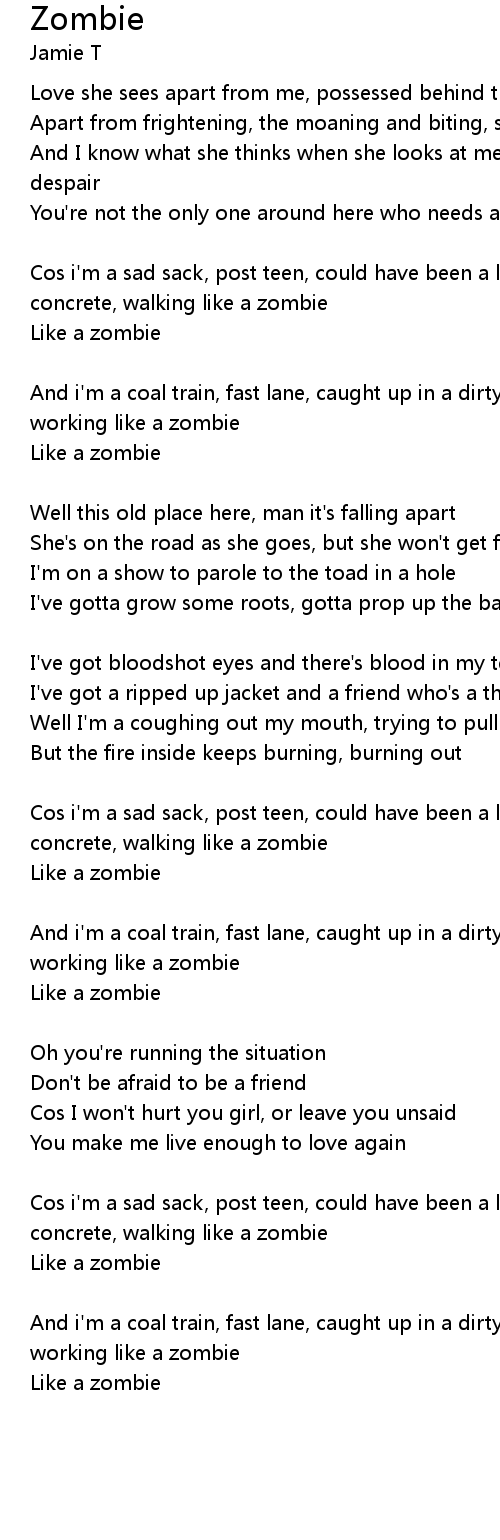 Cos i'm a sad sack, post teen, could have been a love machine, no dream, concrete, walking like a zombie |