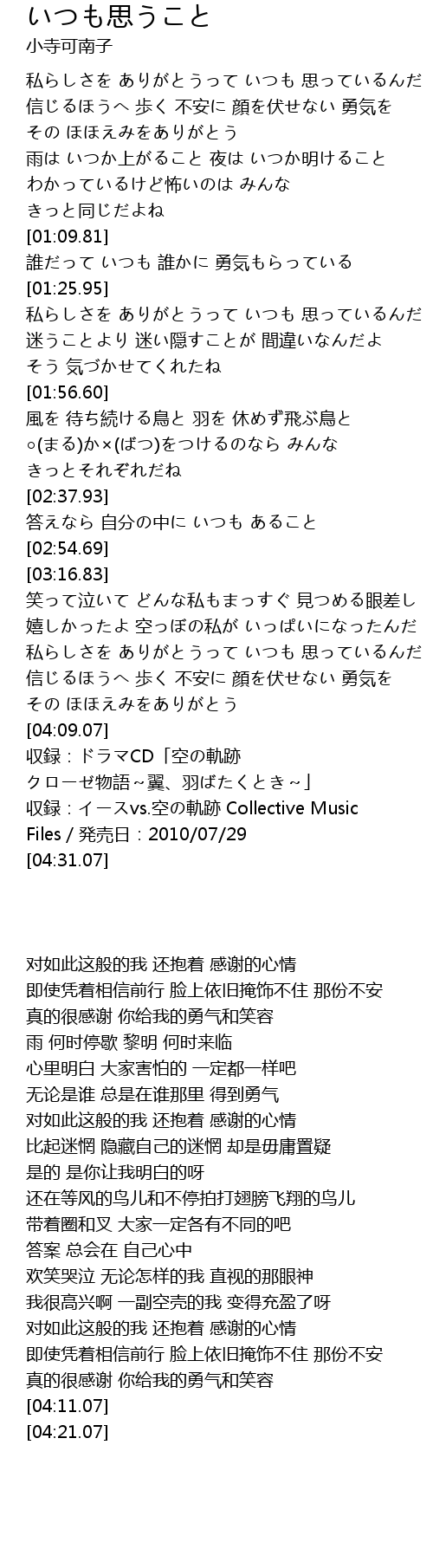 | [01:29.53] | 私らしさを ありがとうって いつも 思っているんだ |