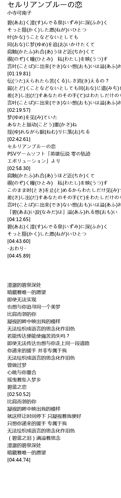 | [04:02.55] | 「碧(あお)い涙(なみだ)は」溢(あふ)れる想(おも)い |