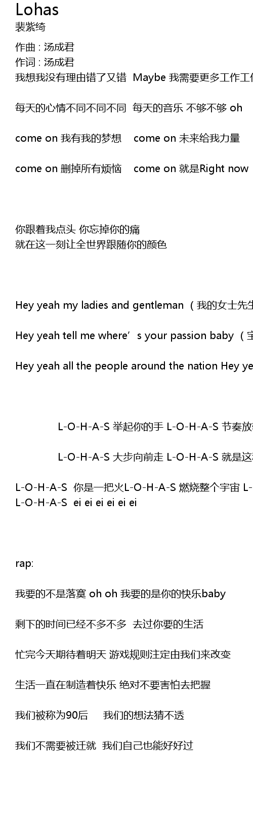| L-O-H-A-S 你是一把火L-O-H-A-S 燃烧整个宇宙 L-O-H-A-S L-O-H-A-S L-O-H-A-S ei ei ei ei ei ei | |