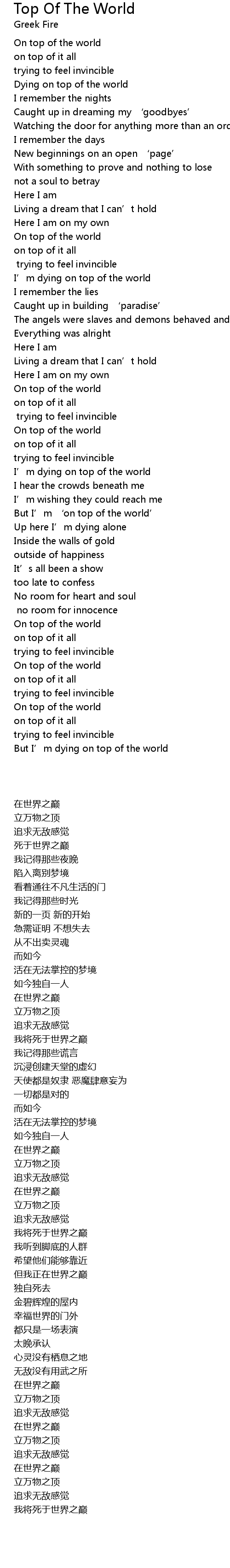 | [03:54.980] | But I' m dying on top of the world |