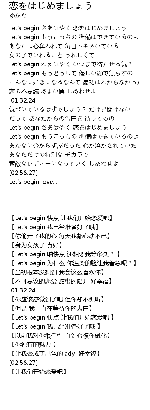 | [02:06.12] | Let's begin さあはやく 恋をはじめましょう |