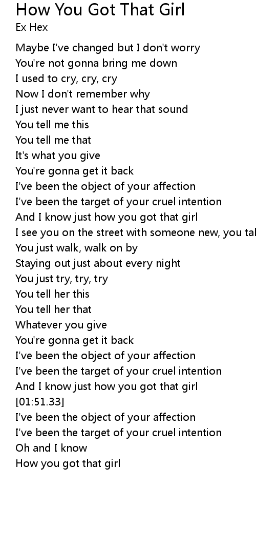 | [00:52.76] | I see you on the street with someone new, you talk sweet |