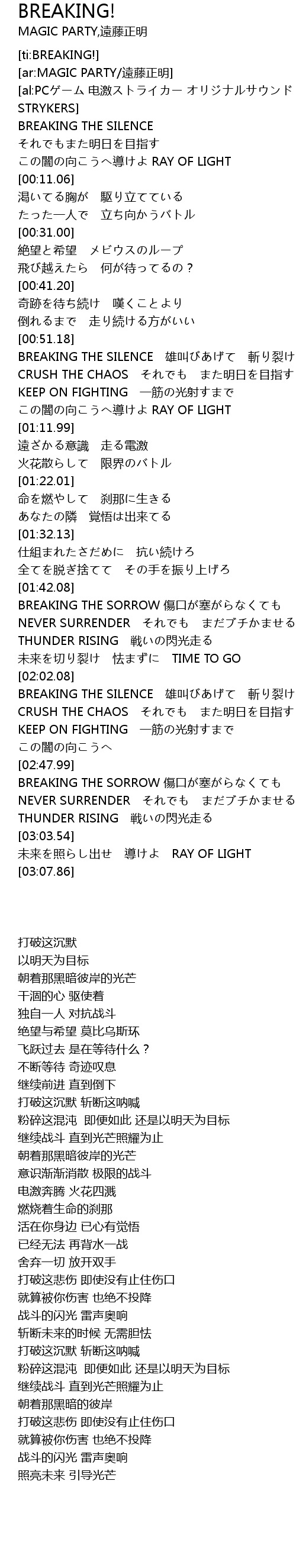 | [02:30.84] | BREAKING THE SILENCE 雄叫びあげて 斬り裂け |