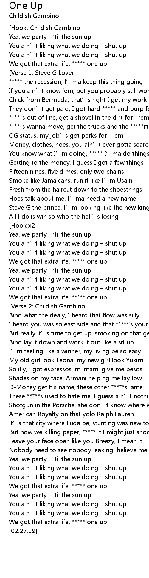| [02:18.40] | You ain' t liking what we doing shut up |