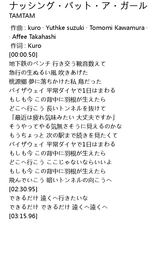 | [00:00.00] | zuo qu : kuro Yuthke suzuki Tomomi Kawamura Junet Kobayashi Affee Takahashi |
