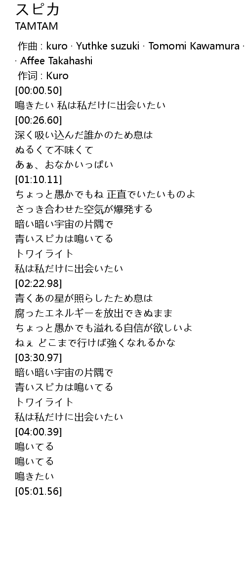 | [00:00.00] | zuo qu : kuro Yuthke suzuki Tomomi Kawamura Junet Kobayashi Affee Takahashi |