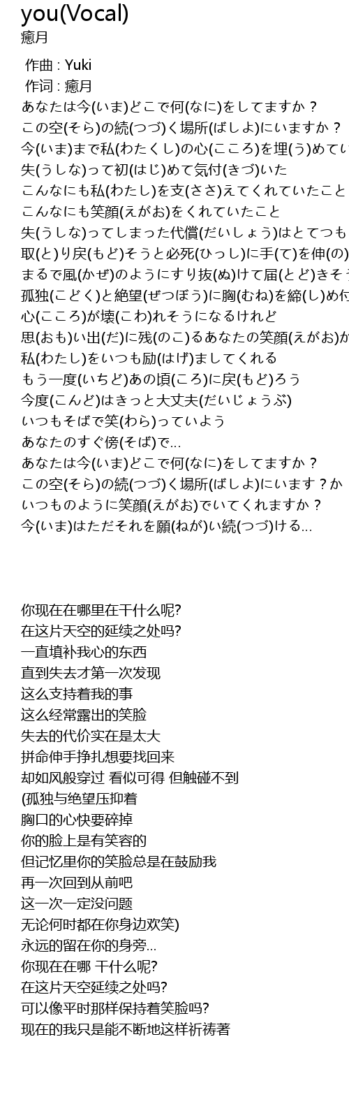 | [00:08.920] | この空(そら)の続(つづ)く場所(ばしよ)にいますか? |